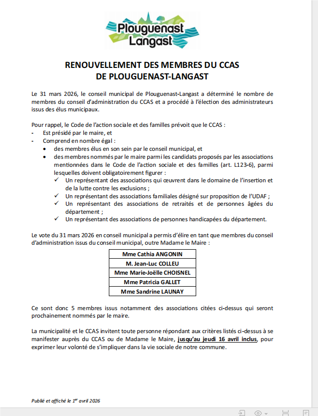 Veuillez trouver une note d'information dans le cadre du renouvellement des membres du CCAS de Plouguenast-Langast. Nous invitons toute personne intéressée à en prendre connaissance.